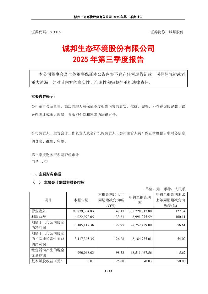 603316-诚邦股份:诚邦生态环境股份有限公司2025年第三季度报告.pdf