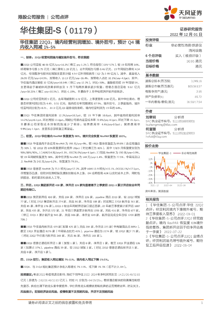 天风证券:华住集团-S(01179)港股公司研究报告-华住集团22Q3:境内经营利润增加、境外扭亏,预计Q4境内收入同减1%-5%.pdf