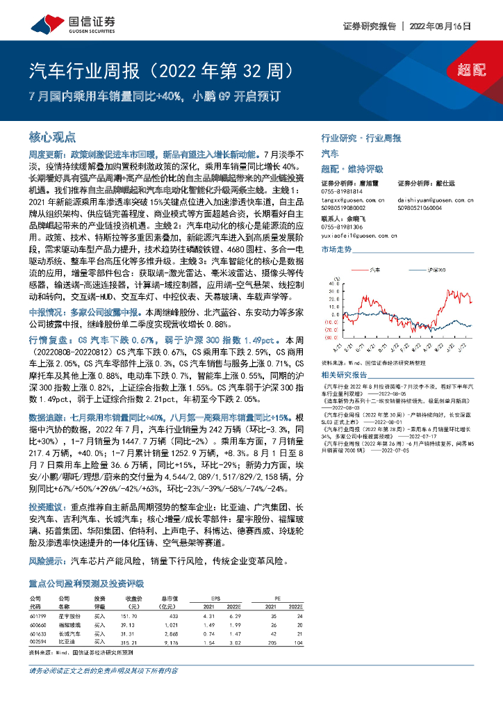 国信证券:汽车行业周报(2022年第32周):7月国内乘用车销量同比+40%,小鹏G9开启预订.pdf