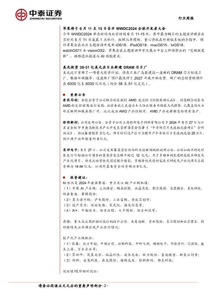 中泰证券:电子行业周报:苹果WWDC2024将于6月中召开,关注果链AI.pdf