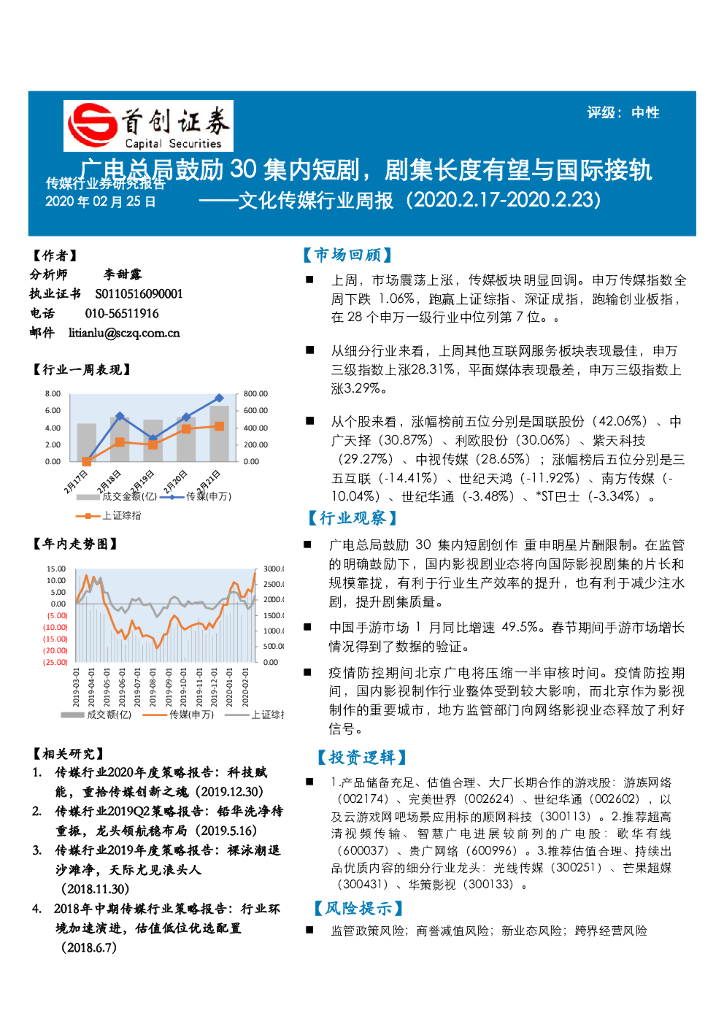 首创证券:文化传媒行业周报:广电总局鼓励30集内短剧,剧集长度有望与国际接轨.pdf