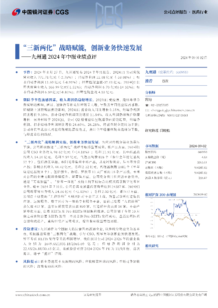 中国银河:九州通2024年中报业绩点评:“三新两化”战略赋能,创新业务快速发展.pdf