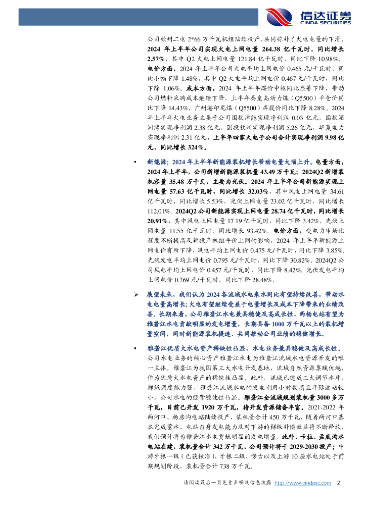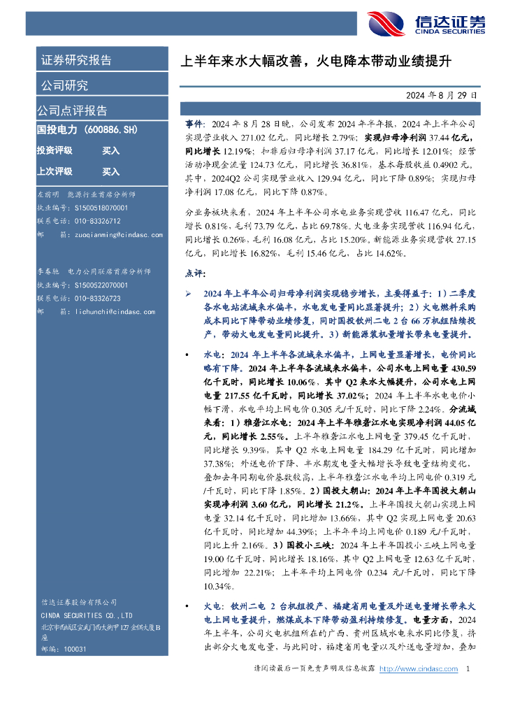 信达证券:国投电力(600886)-上半年来水大幅改善,火电降本带动业绩提升.pdf