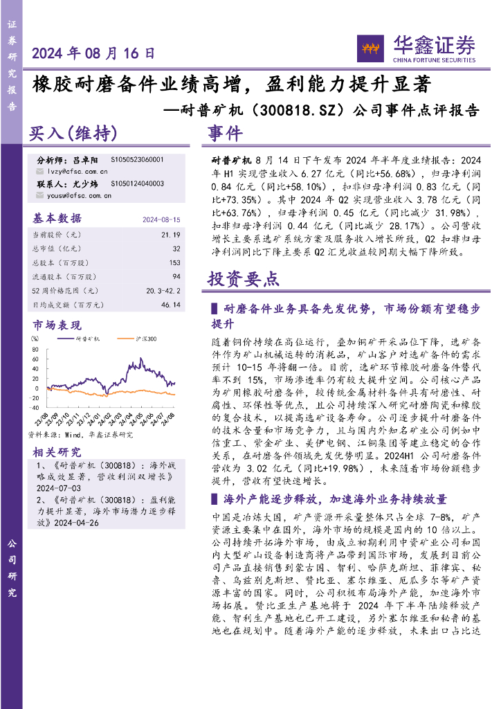 华鑫证券:耐普矿机(300818)-公司事件点评报告:橡胶耐磨备件业绩高增,盈利能力提升显著.pdf