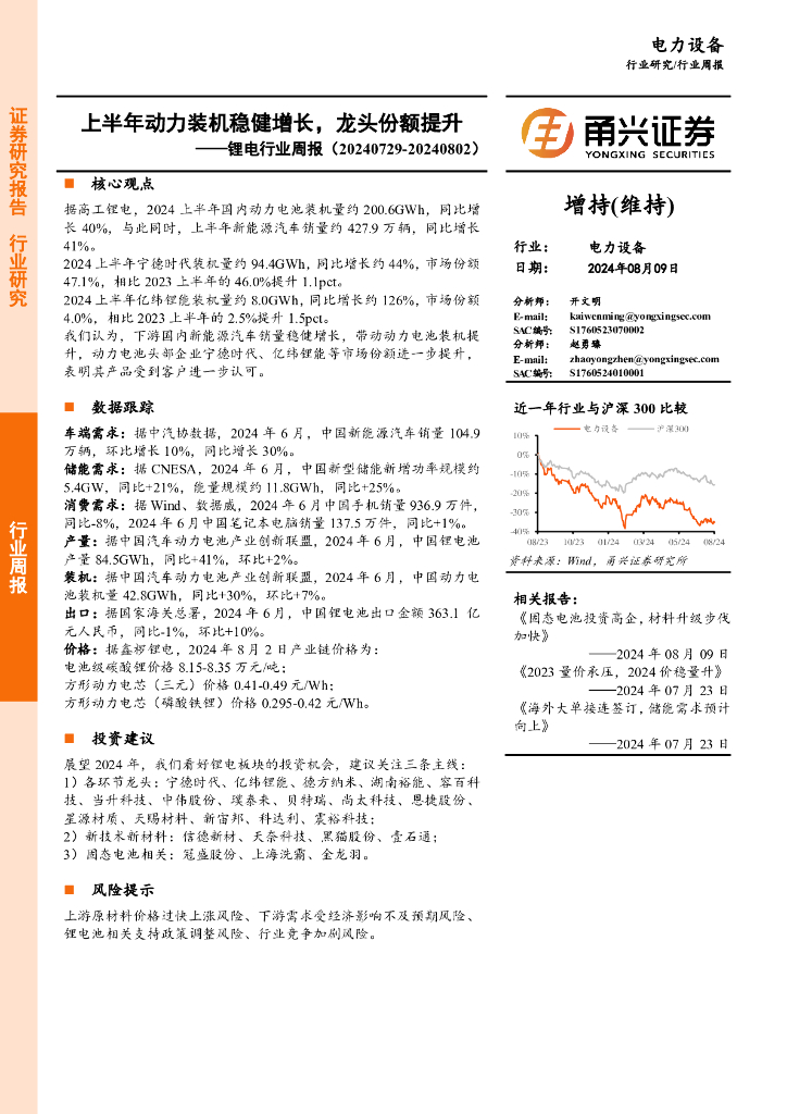 甬兴证券:锂电行业周报:上半年动力装机稳健增长,龙头份额提升.pdf