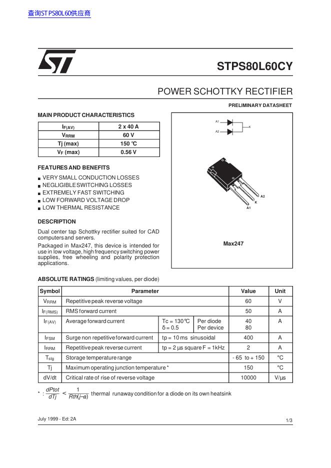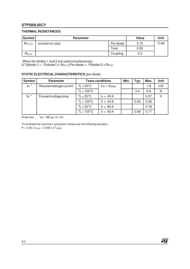 ST STPS80L60CY POWER SCHOTTKY RECTIFIER 数据手册.pdf