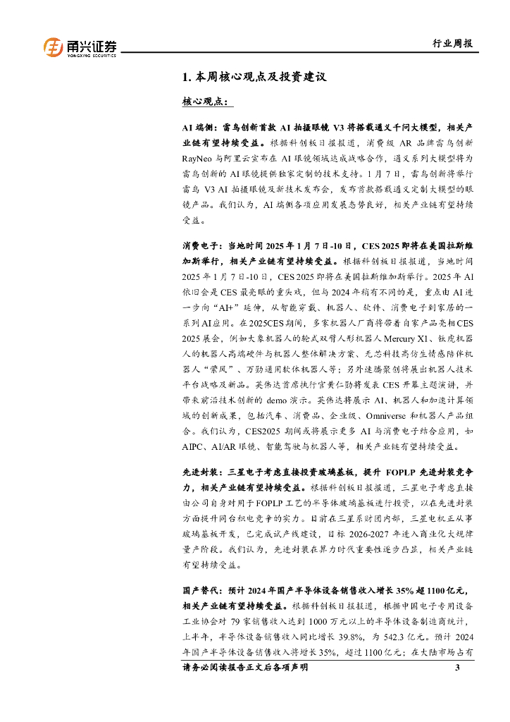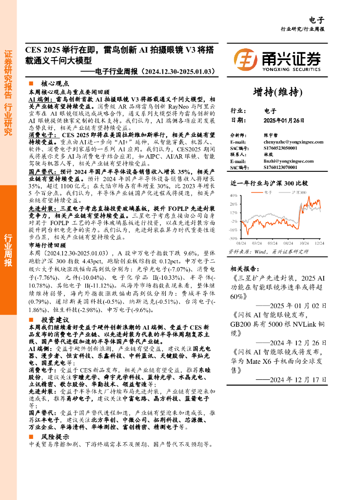 甬兴证券:电子行业周报:CES2025举行在即,雷鸟创新AI拍摄眼镜V3将搭载通义千问大模型.pdf