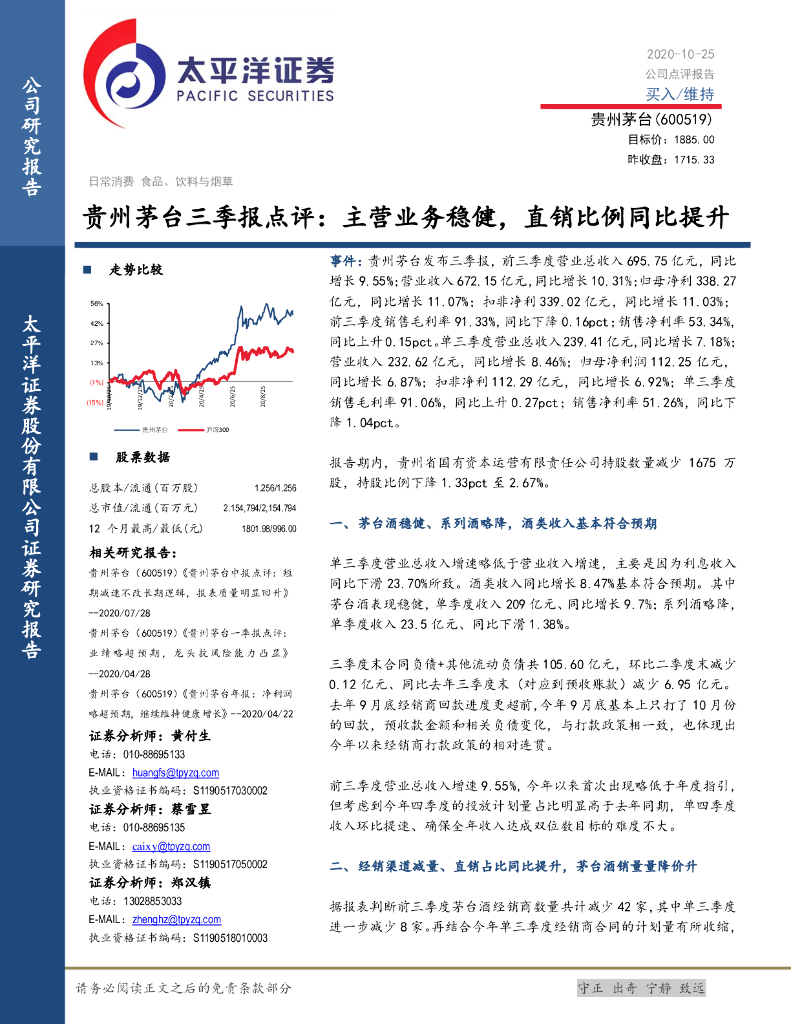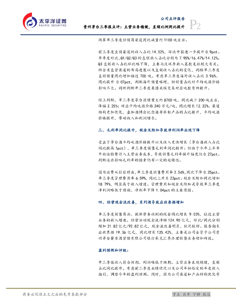 太平洋证券:贵州茅台三季报点评:主营业务稳健,直销比例同比提升.pdf
