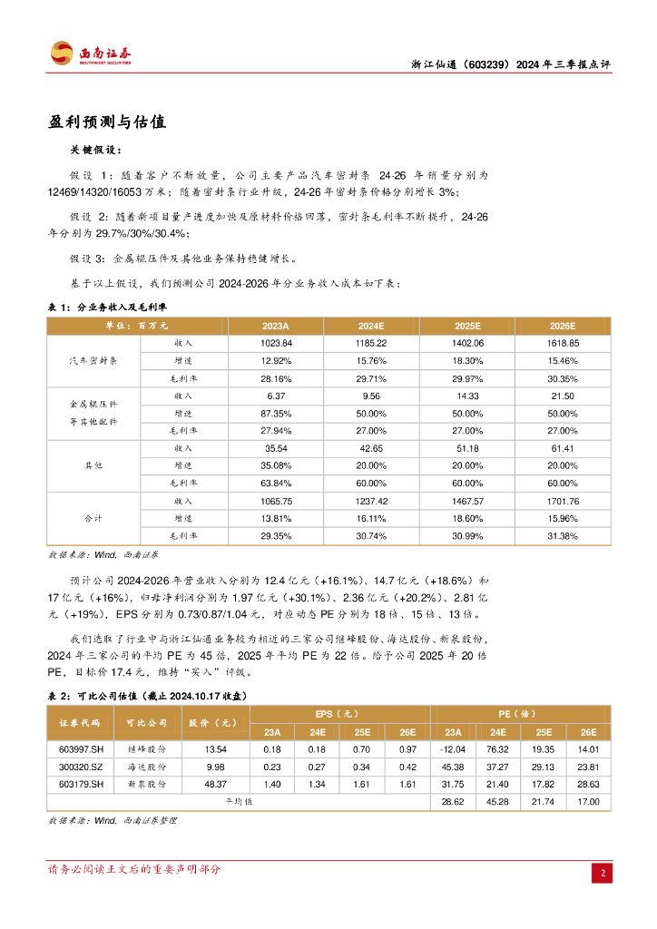西南证券:浙江仙通(603239)-2024年三季报点评:供应链降价压力传导,Q3盈利有所承压.pdf