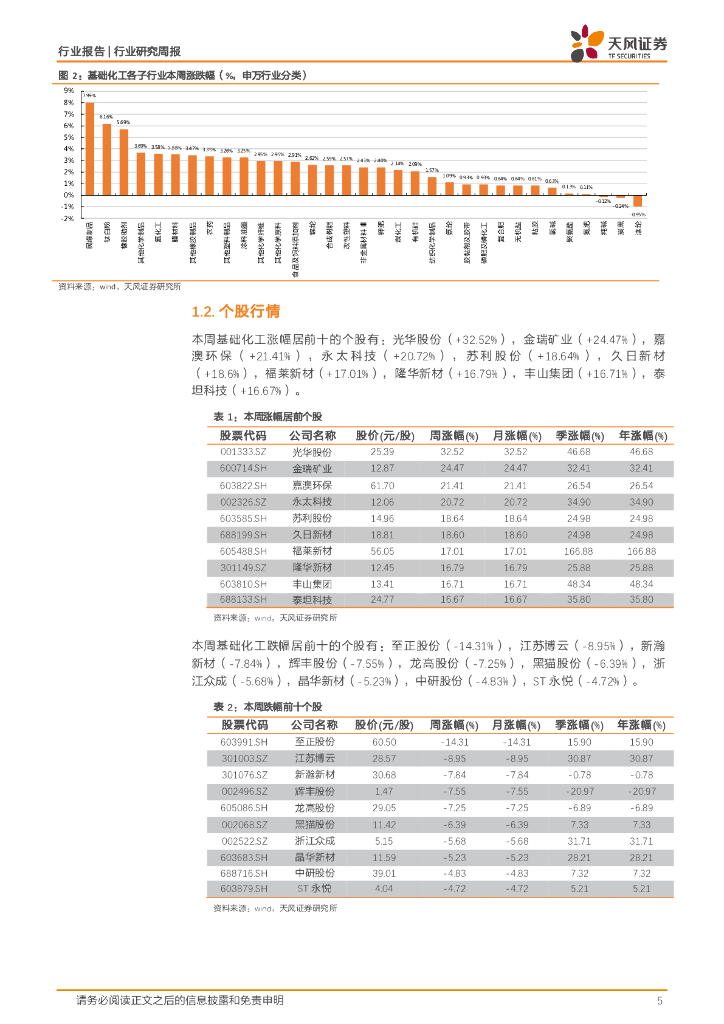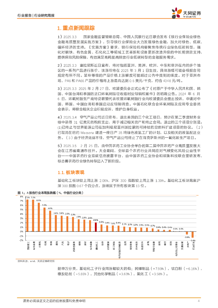 天风证券:基础化工行业研究周报:两部门,强化对石化化工等领域工艺革新和设备更新改造升级的中长期贷款支持,硫磺、三氯乙烯价格上涨.pdf