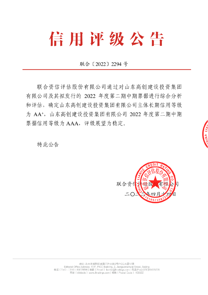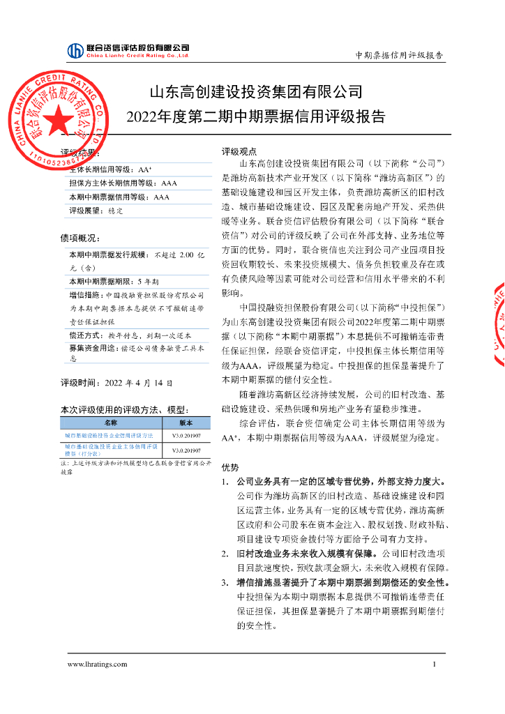 联合资信:山东高创建设投资集团有限公司2022年度第二期中期票据信用评级报告.pdf