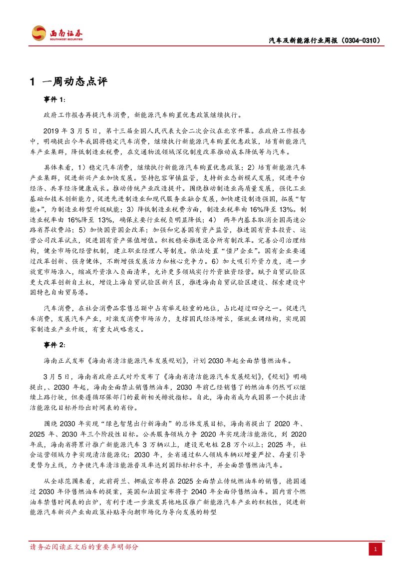 西南证券:汽车及新能源行业周报:政府工作报告再提汽车消费,海南2030年禁售燃油车.pdf