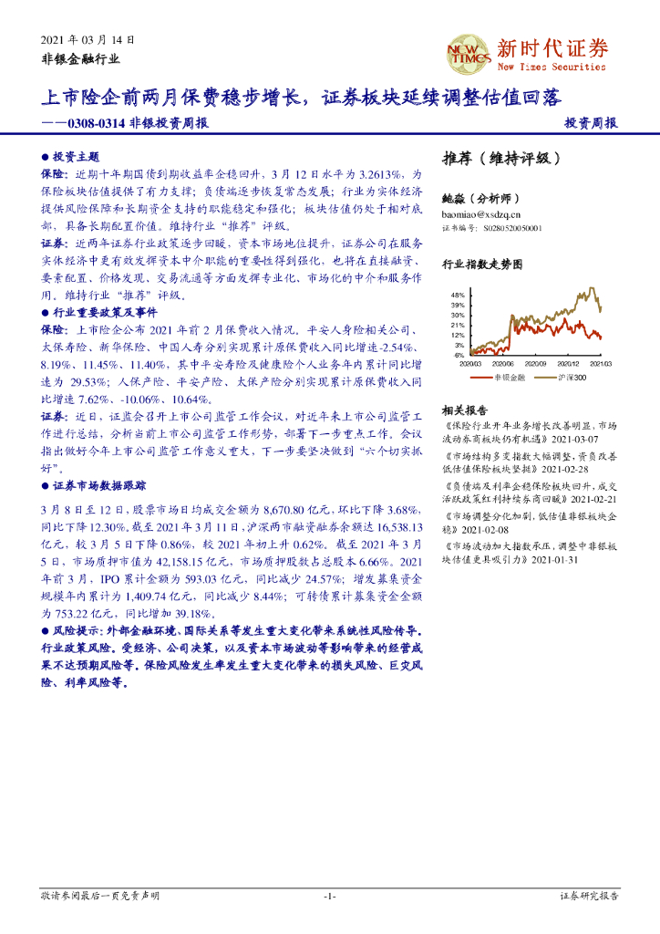 新时代证券:非银投资周报:上市险企前两月保费稳步增长,证券板块延续调整估值回落.pdf