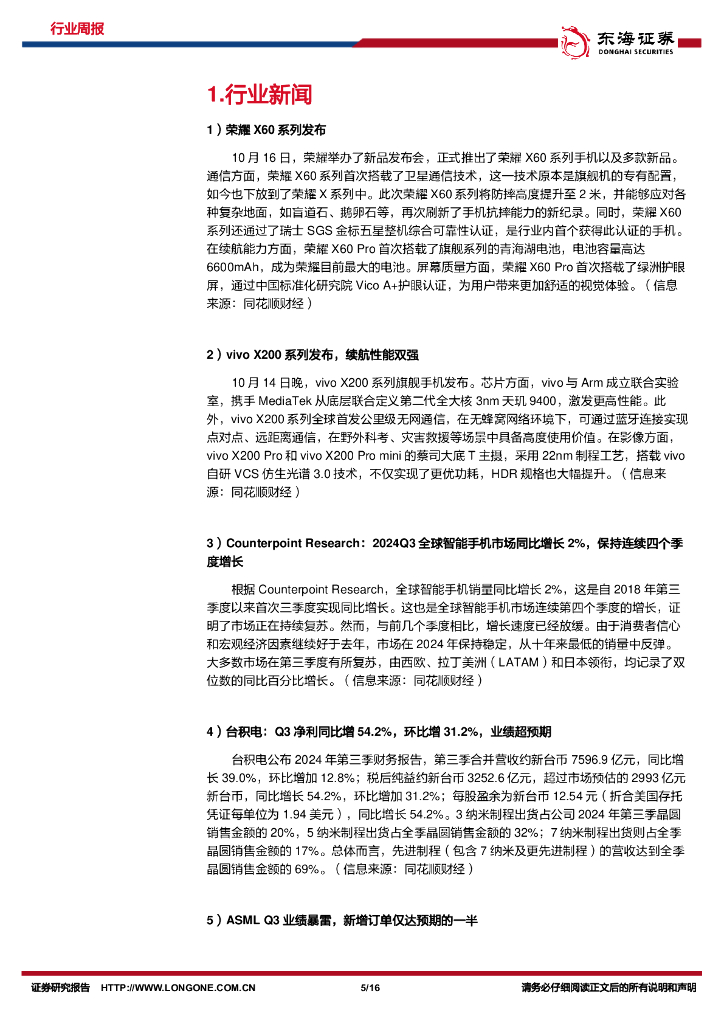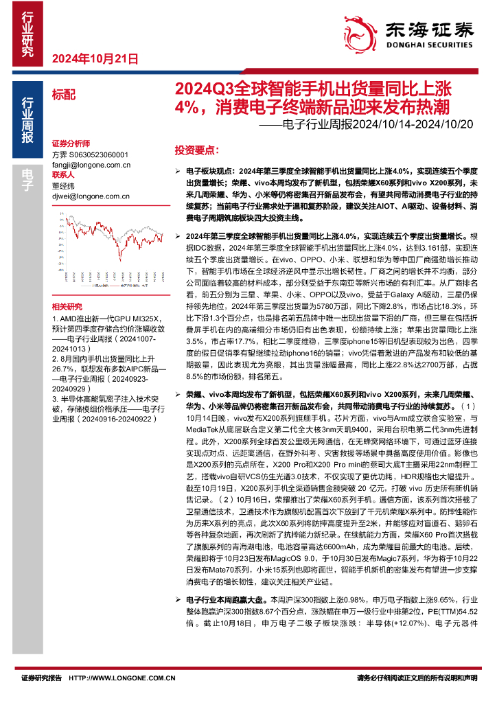 东海证券:电子行业周报:2024Q3全球智能手机出货量同比上涨4%,消费电子终端新品迎来发布热潮.pdf