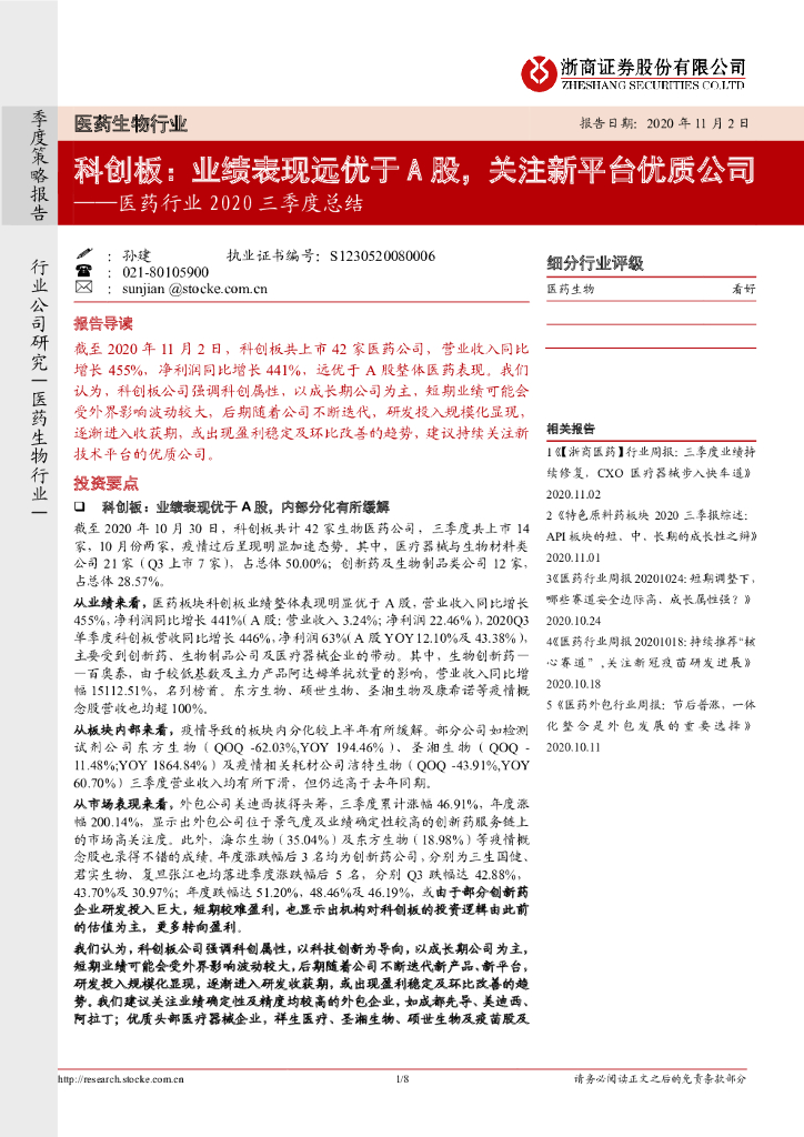 浙商证券:医药行业2020三季度总结:科创板:业绩表现远优于A股,关注新平台优质公司.pdf