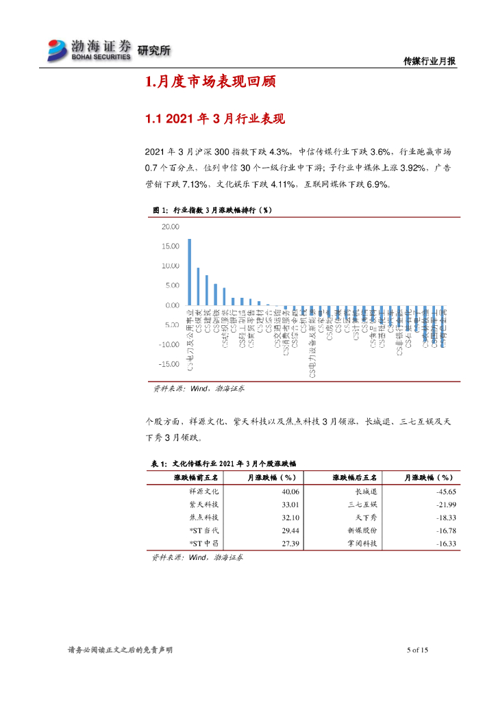 渤海证券:传媒行业月报:三月行情略显平淡,继续关注行业一季报表现.pdf
