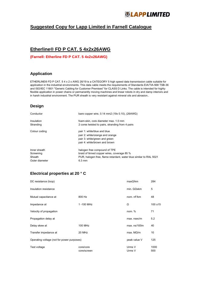 LAPP KABEL Suggested Copy for Lapp Limited in Farnell Catalogue Etherline FD P CAT. 5 4x2x26AWG 数据手册.pdf