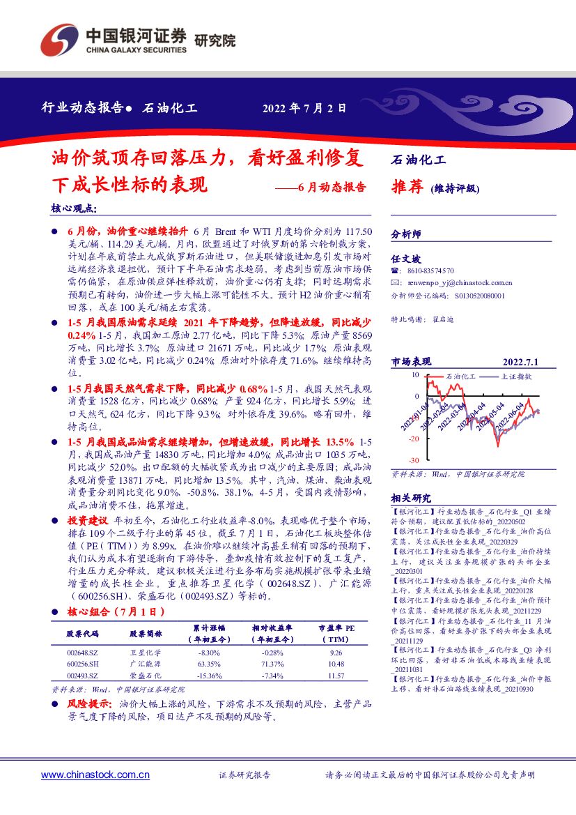 中国银河:石油化工6月动态报告:油价筑顶存回落压力,看好盈利修复下成长性标的表现.pdf
