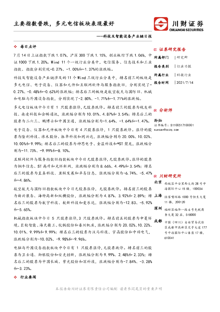 川财证券:科技及智能设备产业链日报:主要指数普跌,多元电信板块表现最好.pdf