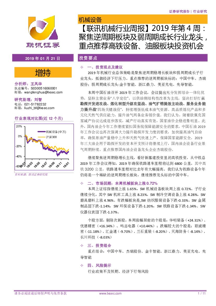 联讯证券:【联讯机械行业周报】2019年第4周:聚焦逆周期板块及弱周期成长行业龙头,重点推荐高铁设备、油服板块投资机会.pdf