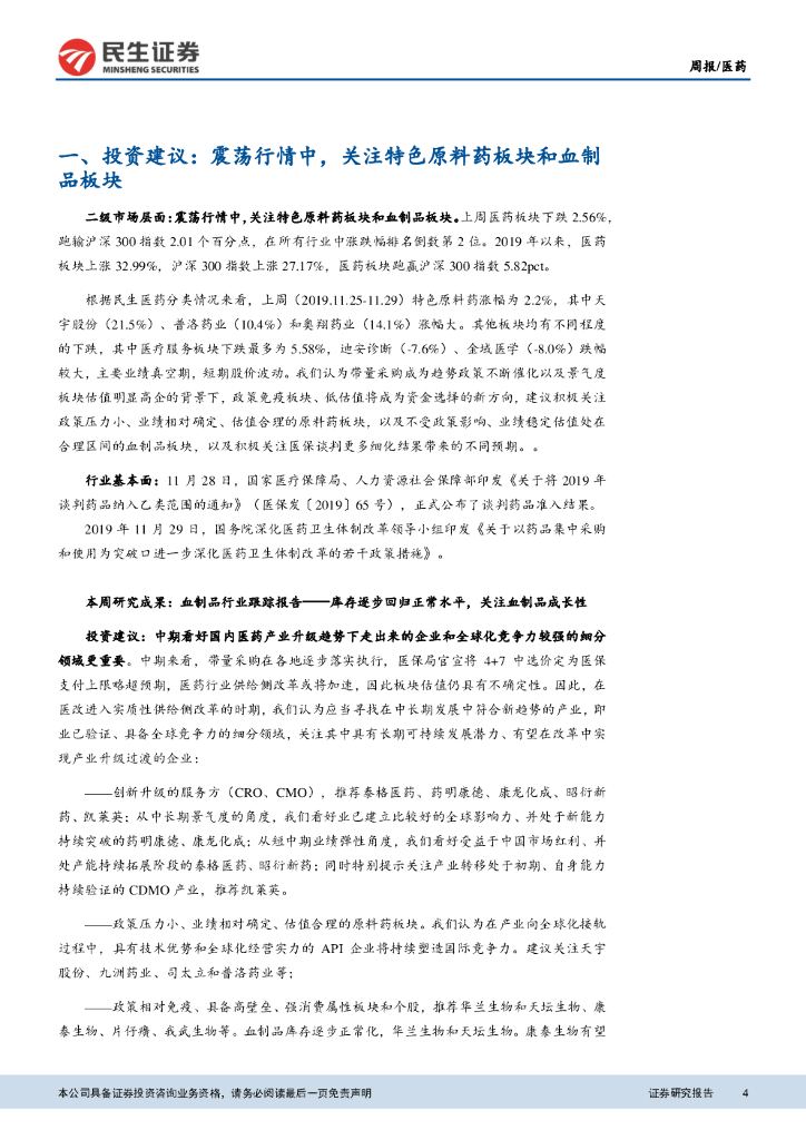 民生证券:医药周报:震荡行情中,关注特色原料药板块和血制品板块.pdf