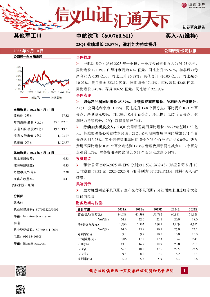 山西证券:中航沈飞(600760)-23Q1业绩增长25.57%,盈利能力持续提升.pdf