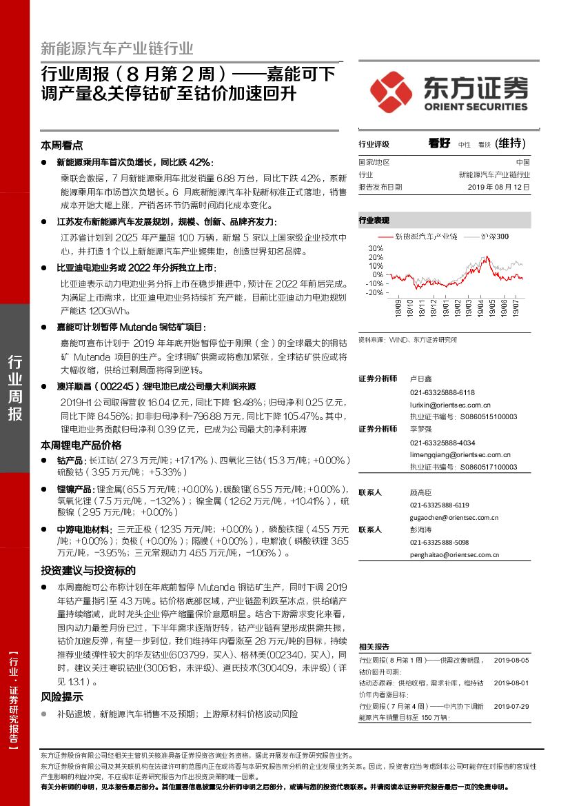 东方证券:新能源汽车产业链行业周报(8月第2周):嘉能可下调产量&关停钴矿至钴价加速回升.pdf
