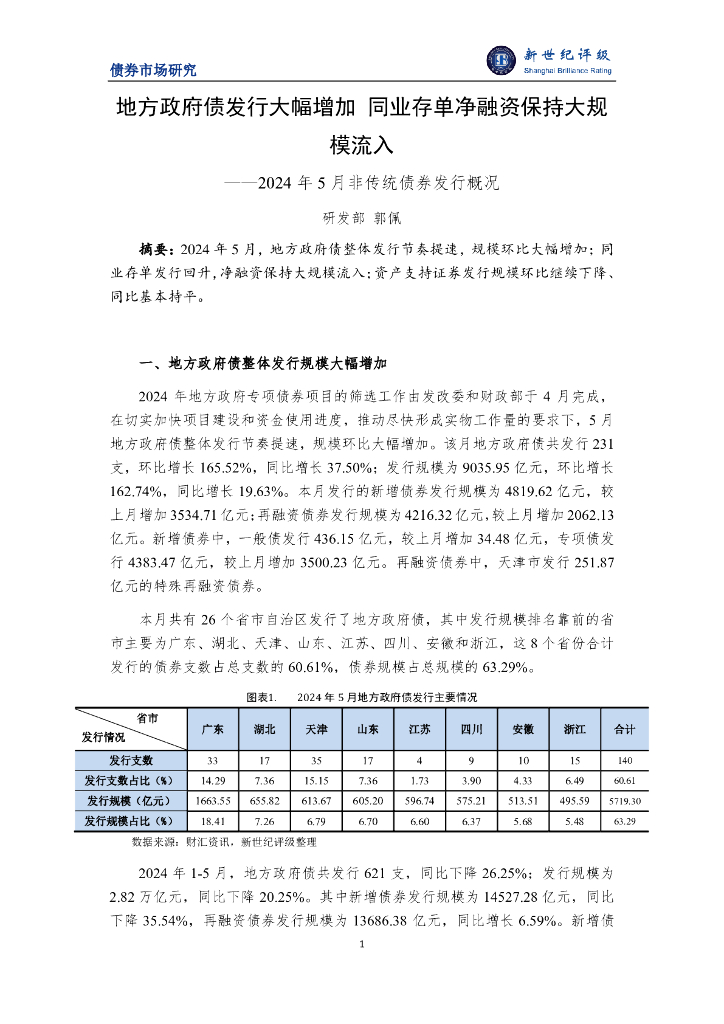 新世纪评级:地方政府债发行大幅增加 同业存单净融资保持大规模流入——2024年5月非传统债券发行概况.pdf