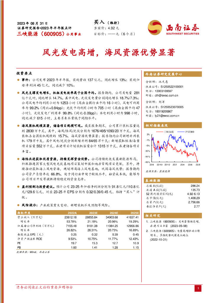 西南证券:三峡能源(600905)-2023年半年报点评:风光发电高增,海风资源优势显著.pdf