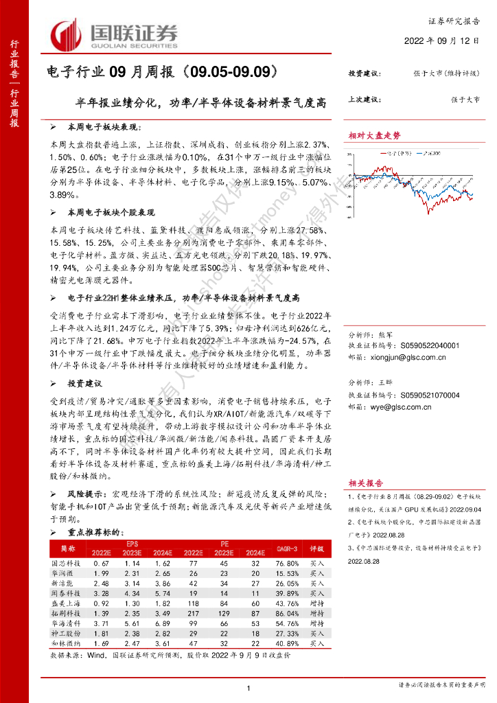 国联证券:电子行业09月周报:半年报业绩分化,功率/半导体设备材料景气度高.pdf