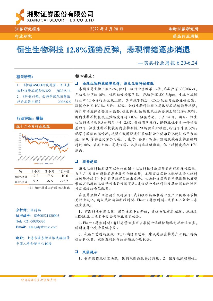 湘财证券:药品行业周报:恒生生物科技12.8%强势反弹,悲观情绪逐步消退.pdf