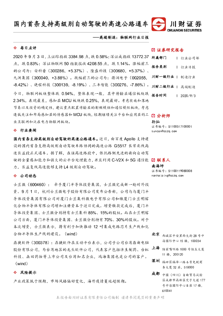 川财证券:高端制造:物联网行业日报:国内首条支持高级别自动驾驶的高速公路通车.pdf