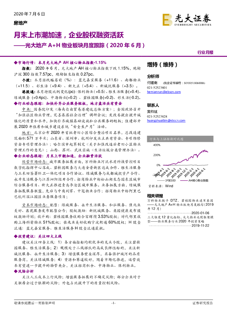 光大证券:光大地产A+H物业板块月度跟踪(2020年6月):月末上市潮加速,企业股权融资活跃.pdf