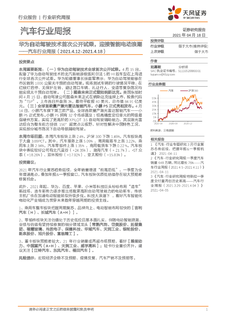 天风证券:汽车行业周报:华为自动驾驶技术首次公开试乘,迎接智能电动浪潮.pdf