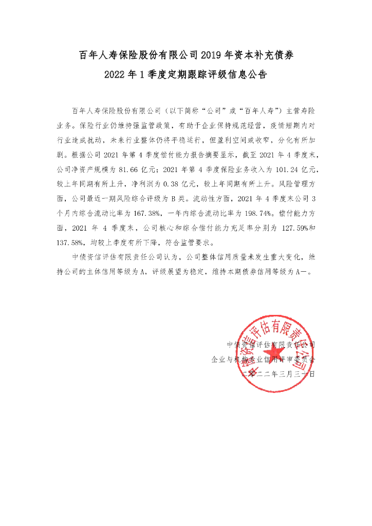 中债资信:百年人寿保险股份有限公司2019年资本补充债券2022年1季度定期跟踪评级信息公告.pdf