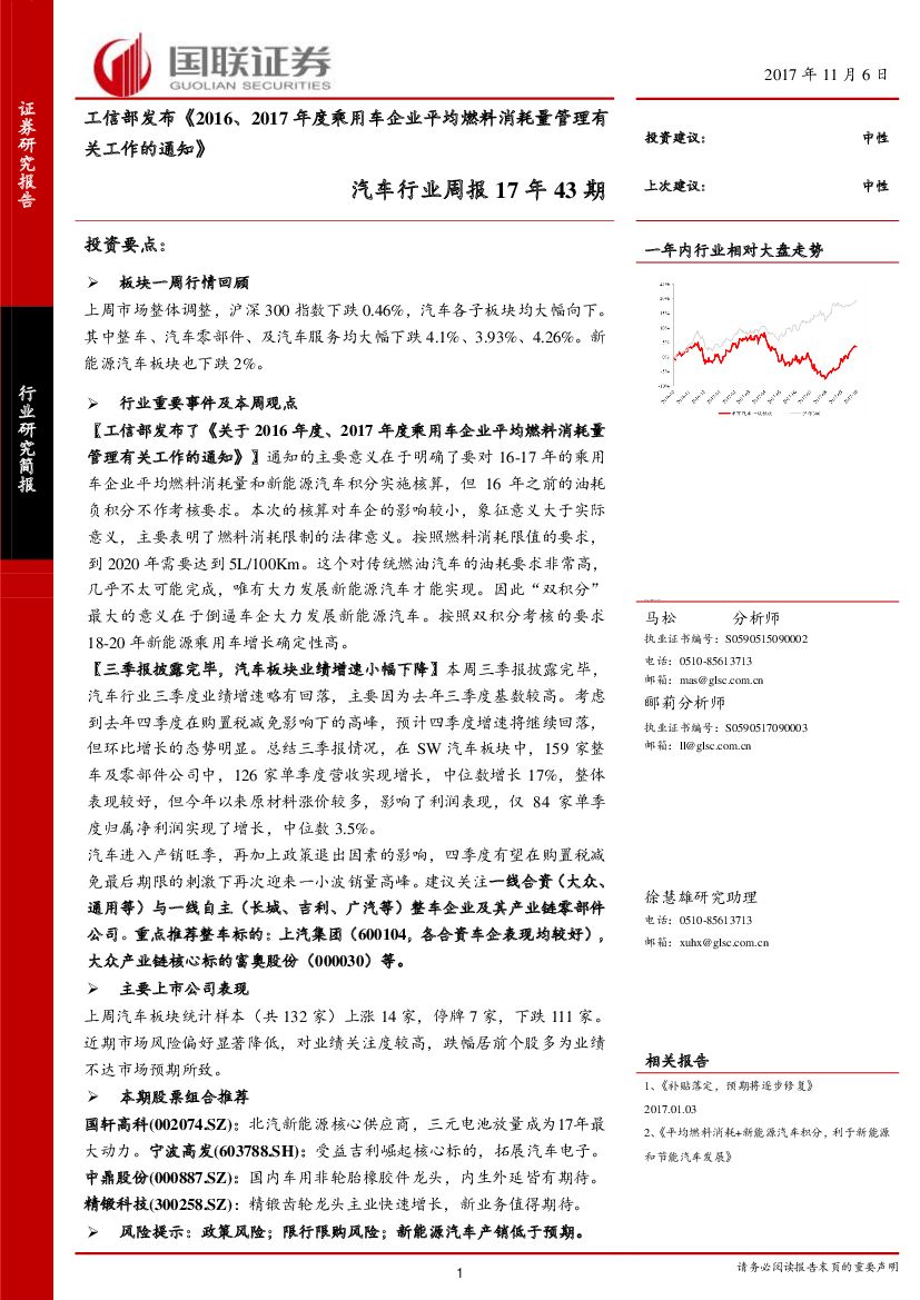 国联证券:汽车行业周报17年43期:工信部发布《 2016、2017年度乘用车企业平均燃料消耗量管理有关工作的通知》.pdf