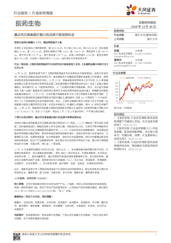 天风证券:医药生物行业研究周报:重点关注具备提价能力的品牌中药投资机会.pdf