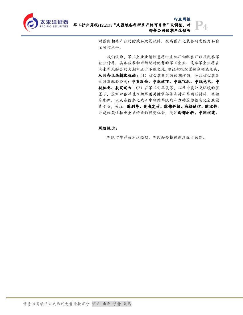 太平洋证券:军工行业周报:“武器装备科研生产许可目录”或调整,对部分公司预期产生影响.pdf
