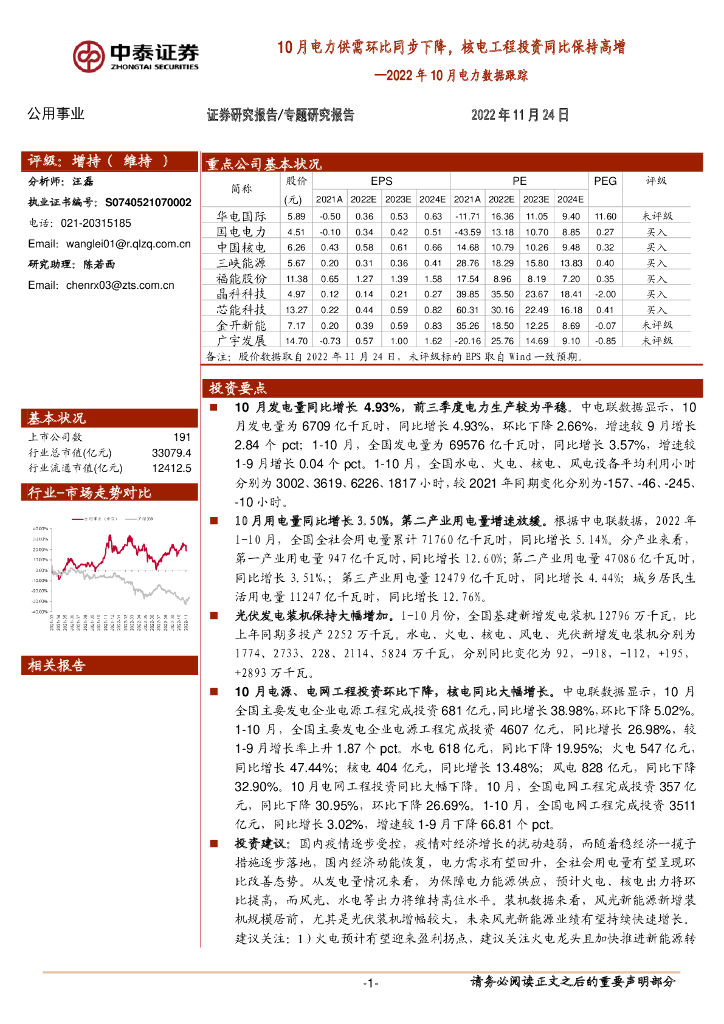 中泰证券:2022年10月电力数据跟踪:10月电力供需环比同步下降,核电工程投资同比保持高增.pdf