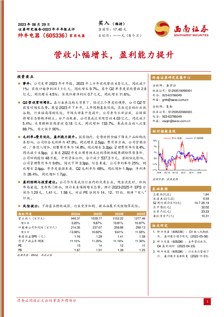 西南证券:帅丰电器(605336)-营收小幅增长,盈利能力提升.pdf
