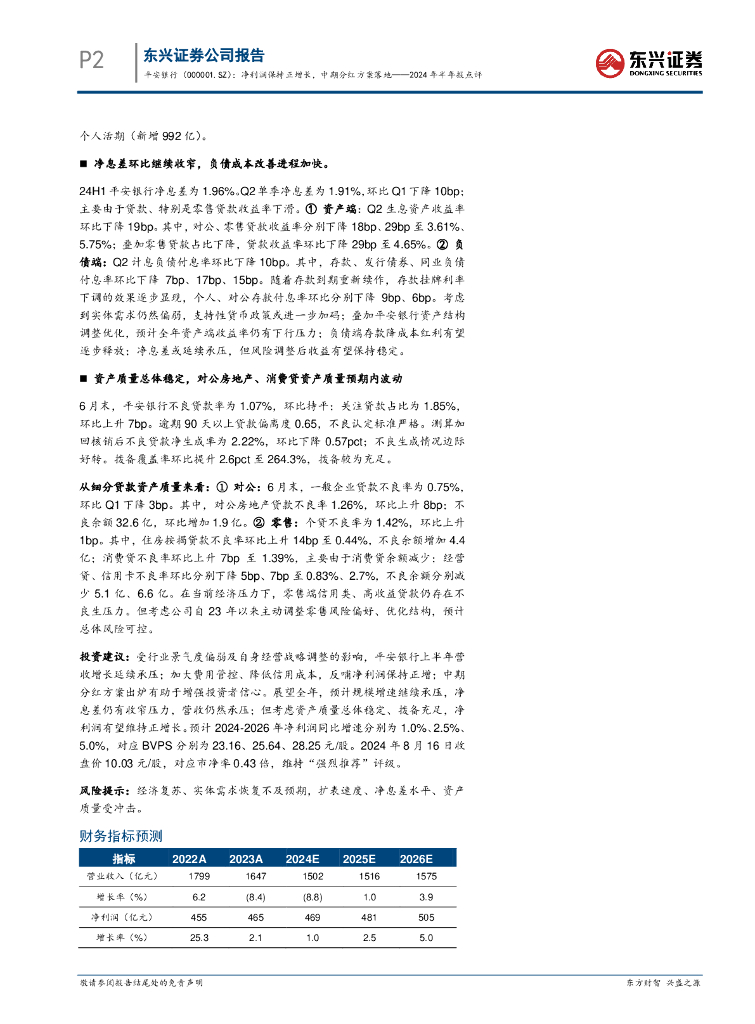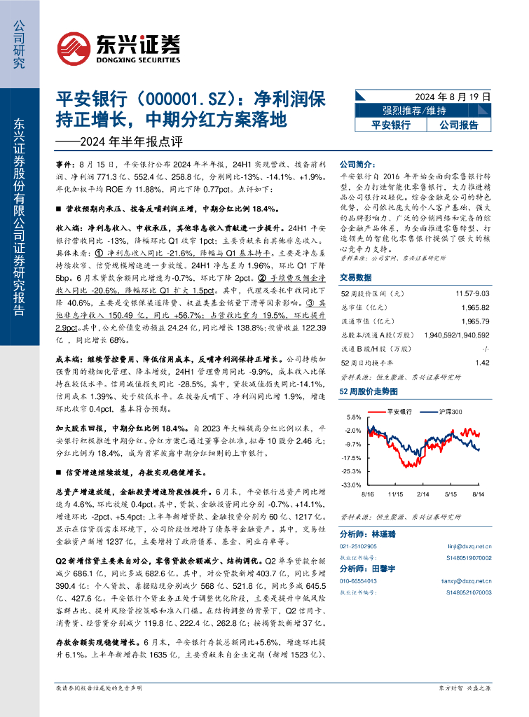 东兴证券:平安银行(000001)-2024年半年报点评:净利润保持正增长,中期分红方案落地.pdf
