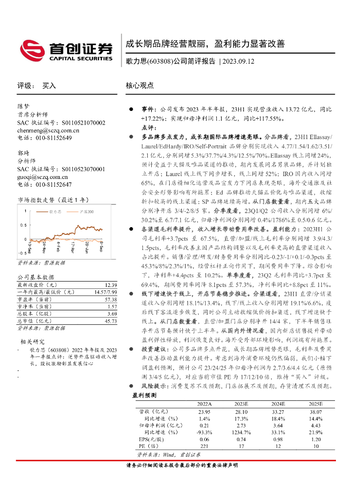 首创证券:歌力思(603808)-公司简评报告:成长期品牌经营靓丽,盈利能力显著改善.pdf