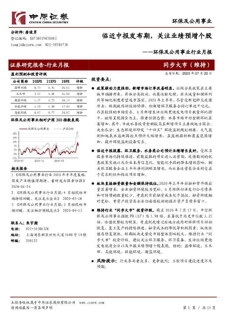 中原证券:环保及公用事业行业月报:临近中报发布期,关注业绩预增个股.pdf