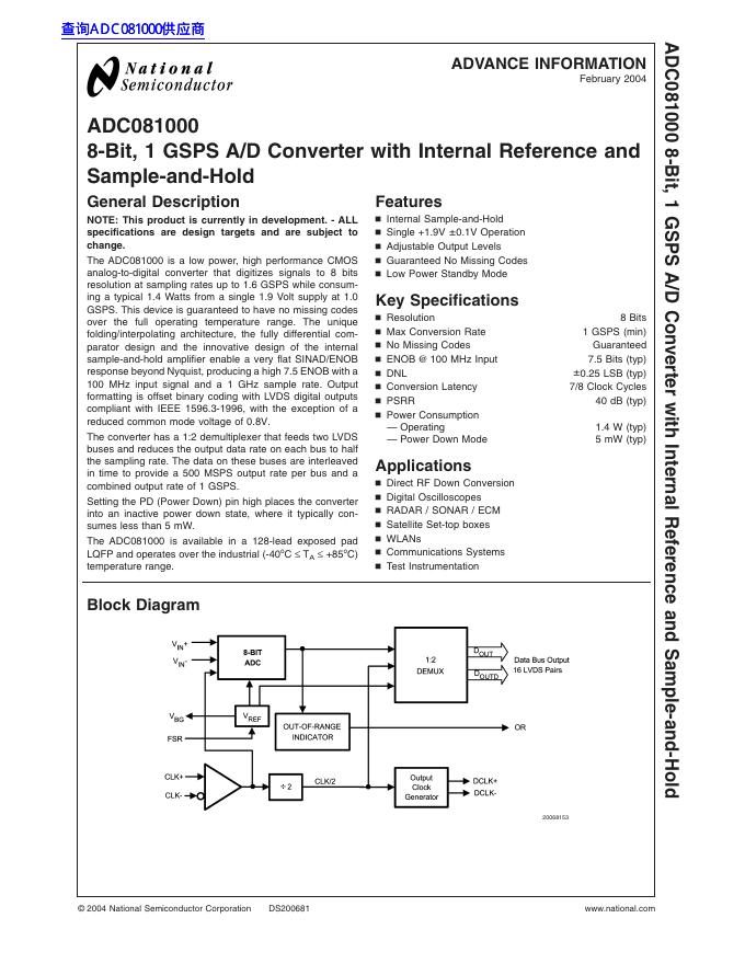 NATIONAL SEMICONDUCTOR - May 27, 2008 DS15BA101 1.5 Gbps Differential Buffer with Adjustable Output Voltage General 说明书