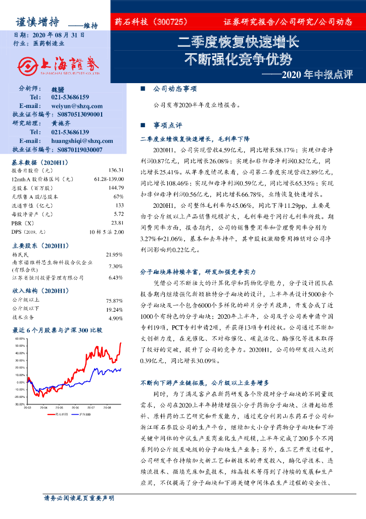 上海证券:药石科技(300725)-2020年中报点评:二季度恢复快速增长 不断强化竞争优势.pdf