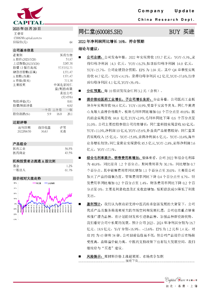 群益证券:同仁堂(600085)-2022年净利润同比增长16%,符合预期.pdf