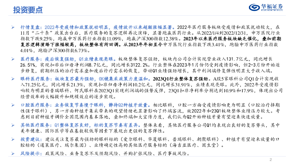 华福证券:医药生物2022年年报及2023年一季报总结:医疗服务:Q1复苏强劲,短期政策扰动出清,龙头将持续受益于渗透率和集中度双重提升.pdf
