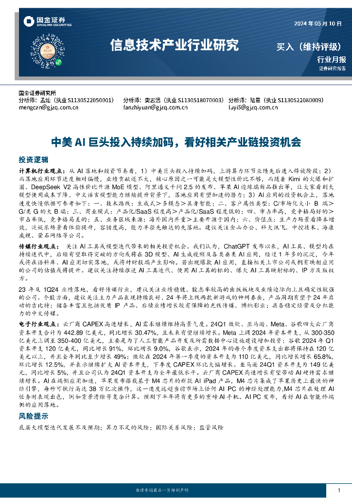 国金证券:信息技术产业行业研究:中美AI巨头投入持续加码,看好相关产业链投资机会.pdf