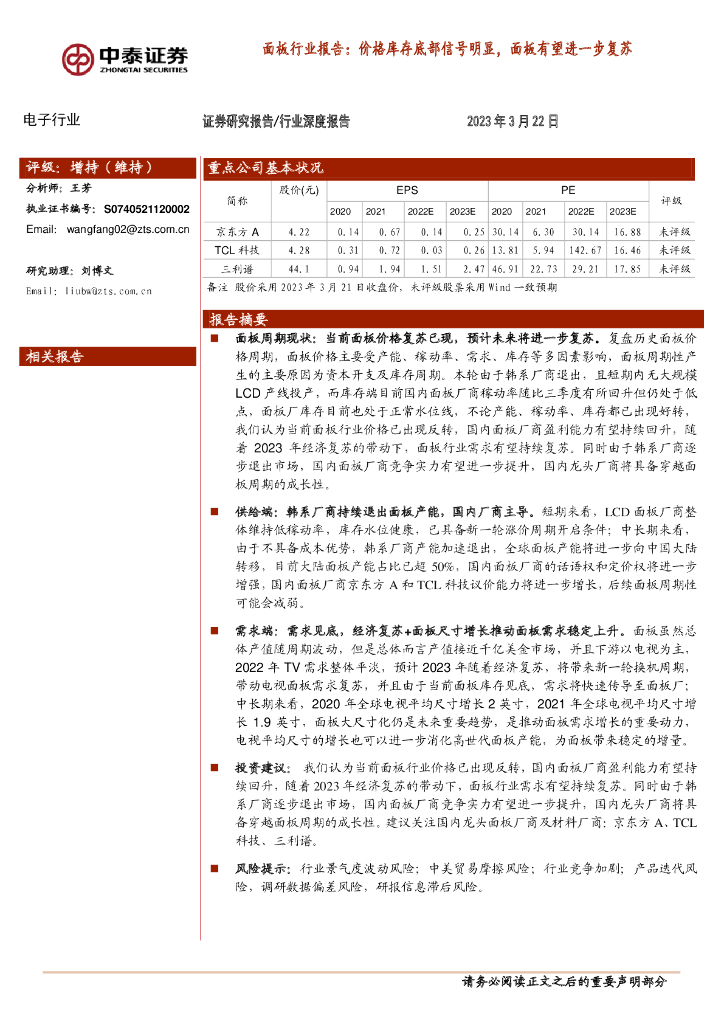 中泰证券:面板行业报告:价格库存底部信号明显,面板有望进一步复苏.pdf