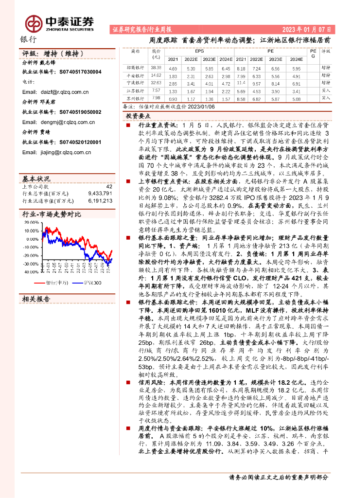中泰证券:银行周度跟踪:首套房贷利率动态调整;江浙地区银行涨幅居前.pdf